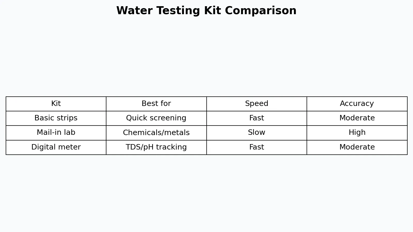 Below is the core water testing comparison. Rather than ranking brands, which change constantly, this comparison focuses on kit categories and where each fits best.