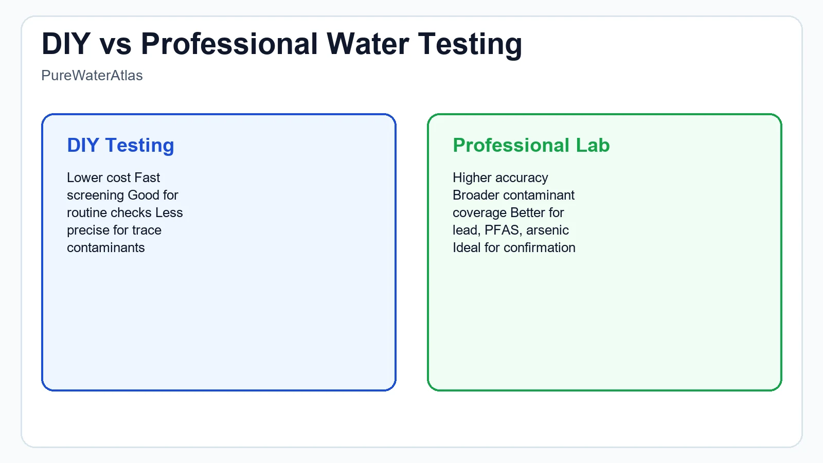 For lead, professional testing is strongly preferred. Lead at the tap often comes from plumbing rather than the source water itself, which makes sampling technique critical. First-draw versus flushed sampling can produce very different results, and low-level detection matters. Consumer lead kits exist, but many are better viewed as rough screening tools than definitive measurements. If lead is the concern, laboratory analysis with proper sampling instructions is the more reliable choice.