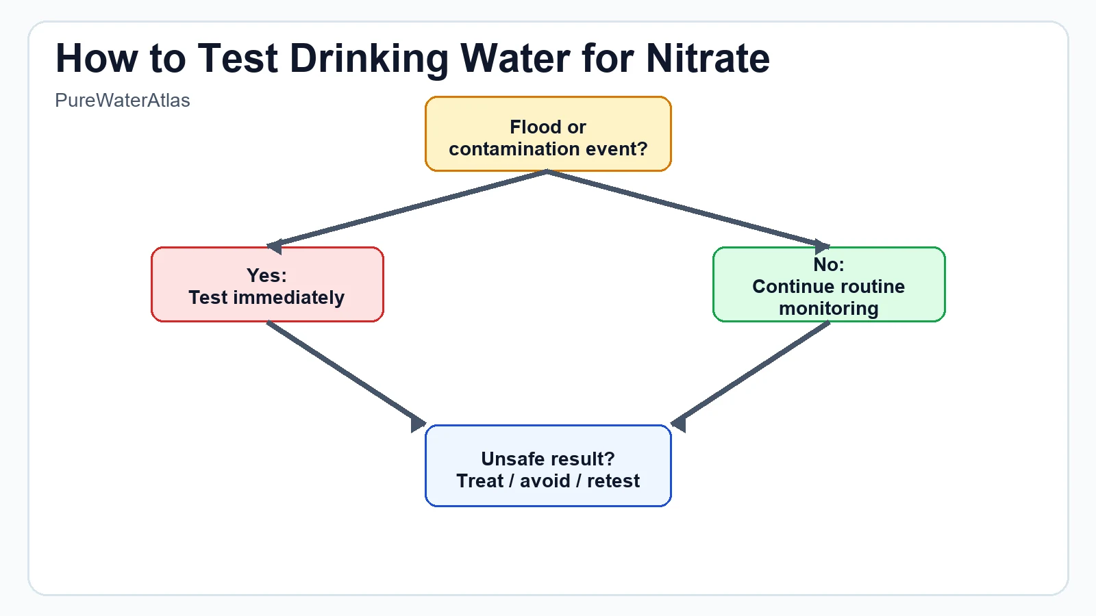 There is no single testing schedule that fits every property, but good practice is to test private well water for nitrate at least annually in higher-risk settings. Additional testing is sensible after conditions that may increase contamination risk or change groundwater flow.