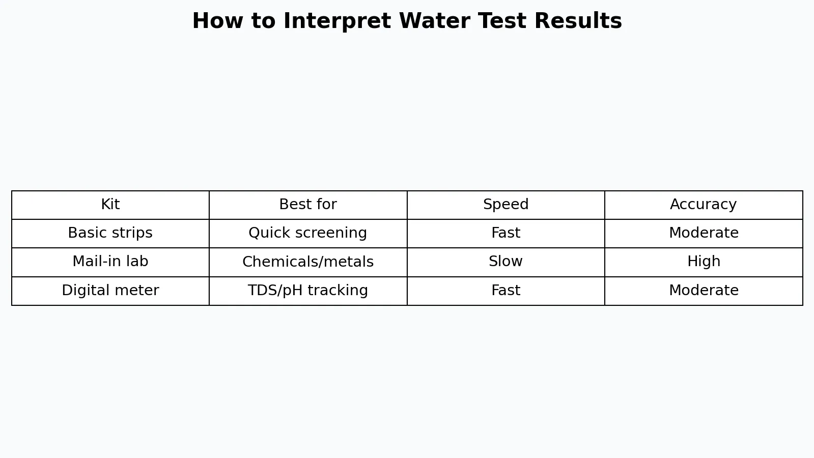 Many basic home test packages do not include everything relevant. Some test only bacteria, pH, hardness, nitrate, and a few metals. Others omit emerging contaminants or important region-specific hazards such as arsenic, uranium, or PFAS. Interpretation must begin with what is present on the report and what is missing.