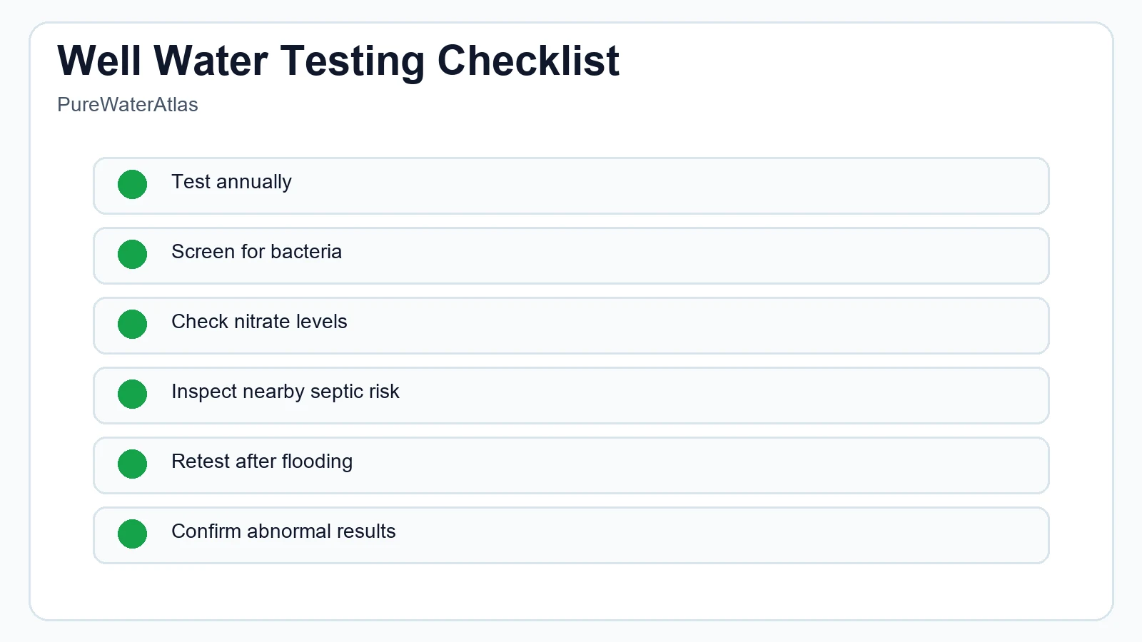 The checklist below is designed as a practical framework. Some items apply to every well owner, while others depend on local geology, land use, recent weather, plumbing materials, or household vulnerabilities.